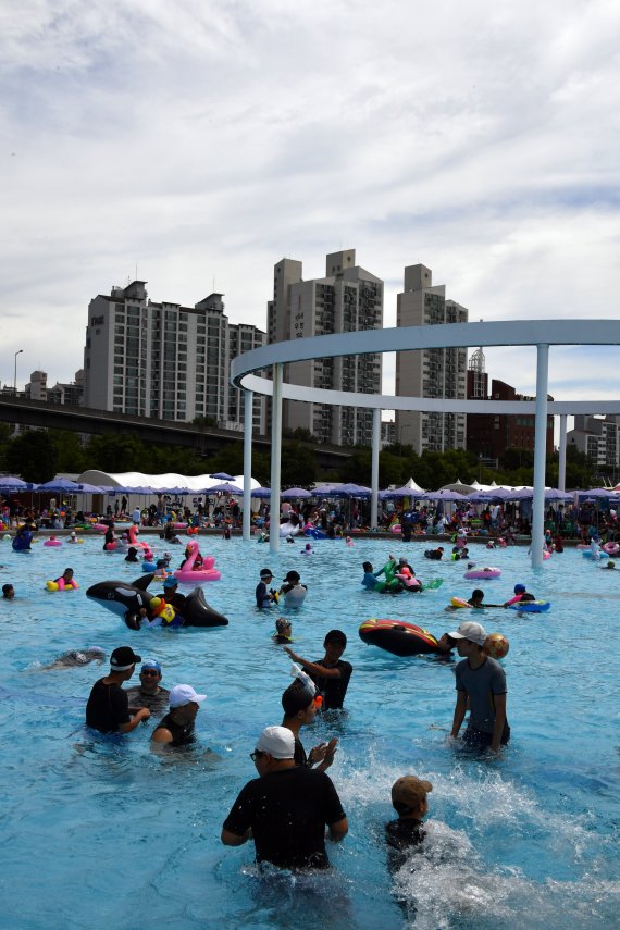 휴일인 8일 맑고 푸른 하늘아래 서울 뚝섬 한강 야외수영장에서 가족단위의 피서객들이 물놀이를 즐기며 더위를 식히고 있다. 사진=서동일 기자