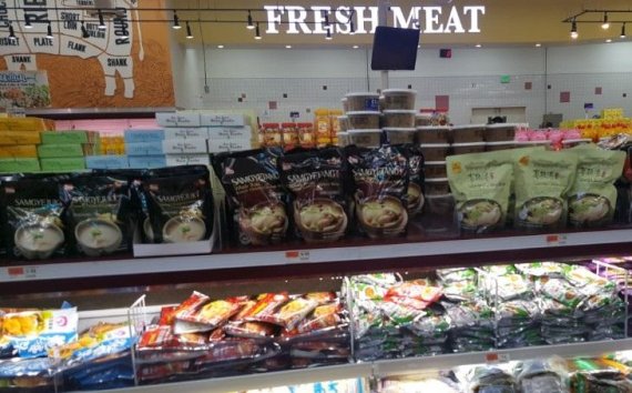 미국 수퍼마켓에 진열된 마니커에프앤지 삼계탕, 삼계죽