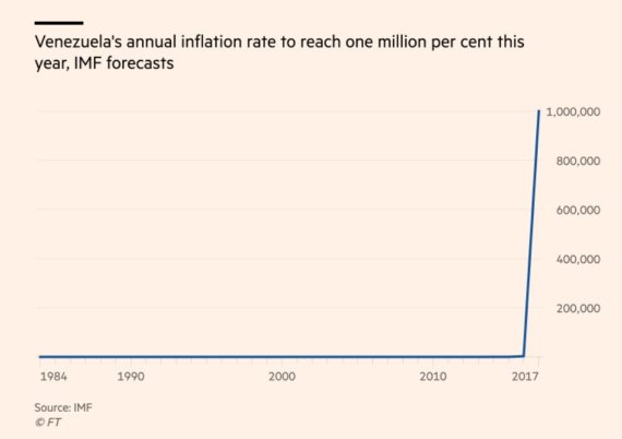 베네수엘라의 올해 물가상승률(인플레이션)이 100만%에 이를 것이라고 국제통화기금(IMF)이 전망했다. 물건을 사려면 손수레에 돈을 싣고 다녀야 했던 1920년대 독일 바이마르 공화국, 최고 796억%에 이르렀던 1990년대말의 짐바브웨의 하이퍼인플레이션과 더불어 역사상 최악의 인플레이션에 나란히 이름을 올릴 전망이다.