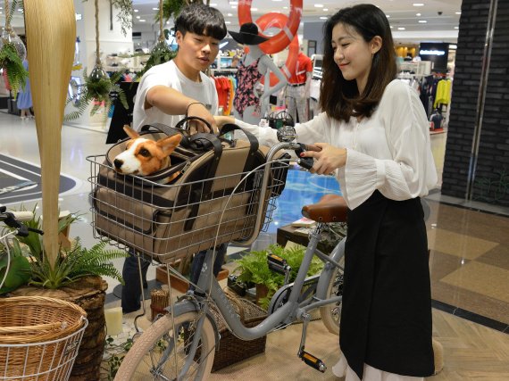 감성적인 자전거 디자인으로 큰 인기를 얻고 있는 부산 부전동 롯데백화점 부산본점 5층 도쿄나인은 최근 반려견 전용 자전거를 선보여 눈길을 끌고 있다고 7월31일 밝혔다. 도쿄나인 반려견 전용 자전거는 자전거 앞에 바구니와 가방이 설치돼 반려견을 태우고 산책을 할 수 있다. 매장을 찾은 고객이 제품을 살펴보고 있다.