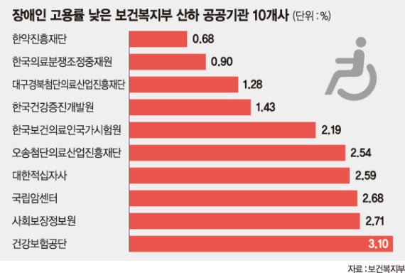 한약진흥재단, 한국의료분쟁조정중재원, 대구경북첨단의료산업진흥재단, 한국건강증진개발원 등은 의무고용률 기준의 절반 수준에도 미치지 못했다.