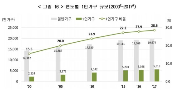 통계청이 27일 발표한 '2017 인구주택총조사'에 따르면 지난해 1인가구 수는 561만9000가구(28.6%)로 조사됐다. 이는 2016년 539만8000가구(27.9%) 대비 22만1000가구(0.7%포인트) 늘어난 수치다.