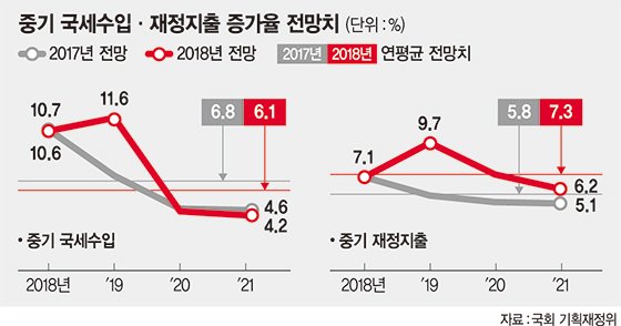 지난해 발표한 2017~2021년 재정운용계획에선 연평균 6.8% 증가할 것으로 전망했으나 1년만에 세수 증가율 전망치를 낮춰 잡은 것이다.