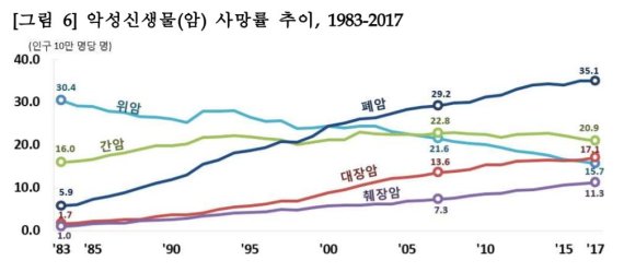 암 사망률은 폐암(35.1명), 간암(20.9명), 대장암(17.1명), 위암(15.7명), 췌장암(11.3명) 순으로 높았다.