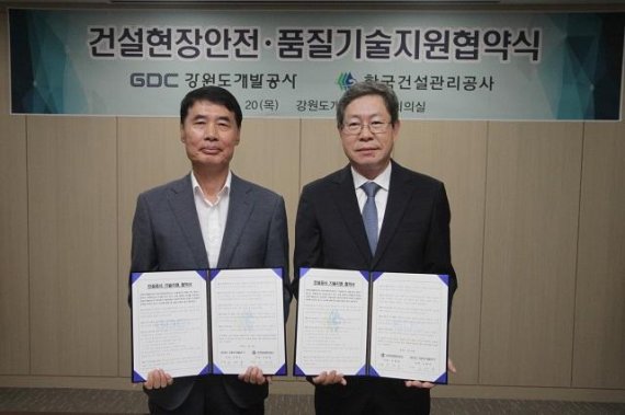 【춘천=서정욱 기자】강원도개발공사(사장 노재수)와 한국건설관리공사(사장 이명훈)가 20일 도개발공사 대회의실에서 ‘건설공사 안전.품질 기술지원을 위한 업무협약’을 체결했다.