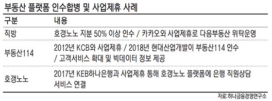 올초 현대산업개발은 부동산 정보업체 '부동산114'를 인수했고 직방은 올 상반기 아파트 실거래가 정보 제공 스타트업인 '호갱노노'를 품에 안았다. 더불어 다음부동산을 운영하는 카카오는 올 4월부터 직방에 다음부동산의 운영권을 넘겼다.