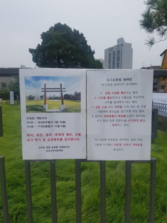 이 때문에 선농단 입구 주변에는 '이곳은 선농단(사적 제436호)이 있는 곳으로 문화재 보호를 위해 애완견의 출입을 삼가 주시기 바랍니다'라는 3m가 넘는 크기의 대형 현수막이 걸려 있다. 입구에도 '오물 유기·투기를 금지한다'는 별도 안내판이 따로 있었다.