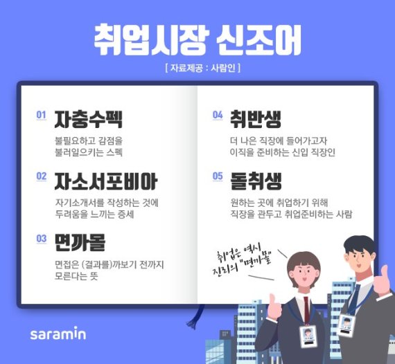 사상 최악의 구직난이 계속되면서 취업과 관련한 여러 가지 신조어들이 지칠 줄 모르고 쏟아지고 있다. 단순히 재미로 웃고 넘길 수도 있지만, 신조어들을 잘 곱씹어 보면 취업시장의 트렌드를 파악함과 동시에 취업 관문을 통과하는 힌트를 얻는 데도 도움이 된다. 17일 구인구직 매칭플랫폼 사람인은 신조어들을 통해 최근 취업 동향은 어떤지, 그리고 신조어를 바탕으로 취업을 성공시키는 실제 팁은 무엇인지 정리했다.
