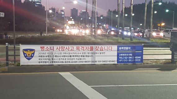 왕복 8차선 대로변에서 벌어진 사고지만 뺑소니 용의자를 찾지 못하고 있다. CC(폐쇄회로)TV가 있었지만 사고 현장을 비추지 못하는 사각지대에 설치돼 있었다. 단서는 사고 현장에서 발견된 헤드라이트 조각뿐이다. 현재 목격자를 찾는 플랜카드가 걸려있다.
