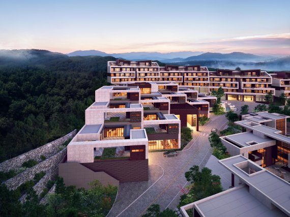 내년 6월 완공을 목표로 공사가 진행 중인 골프빌리지는 9개의 정자를 상징하는 '클라우드 나인', 10개의 반상을 나타내는 '더 큐브 텐', 12폭의 자연 병풍의 형상을 딴 '오션 테라스' 등 3가지 타입으로 설계됐다.