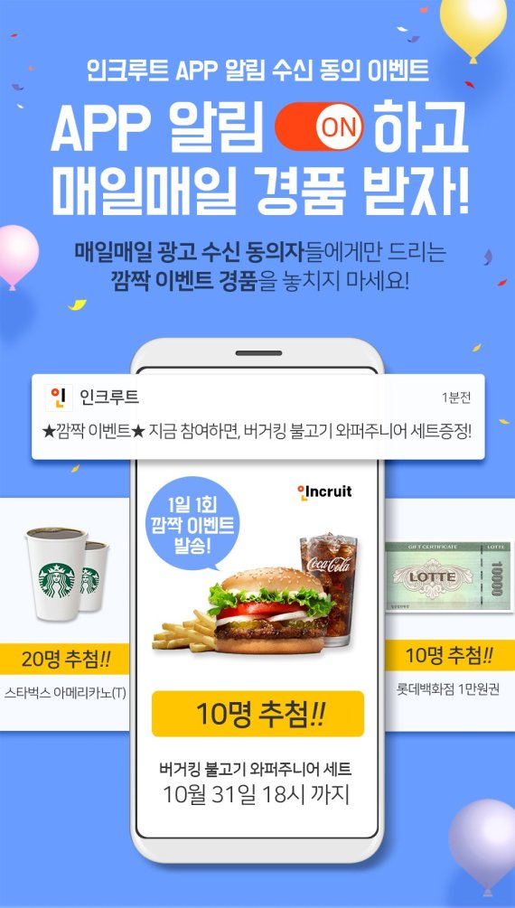 취업포털 인크루트에서 지난 10월29일부터 오는 11월 23일까지 ‘앱 알림 수신 동의 이벤트’를 실시한다고 10월31일 밝혔다.