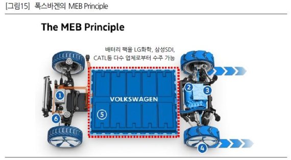 폭스바겐이 밝힌 MEB는 오는 2021년 본격 출시되는 3세대 전기차의 전용 파워트레인을 말한다. 배터리 팩, 구동모터, 휠, 설계 등을 표준화해 보다 효율적으로 전기차를 양산해 내는 것을 의미한다. 예컨대 배터리 팩 공간과 스펙을 정해놓기만 하면 다수의 2차전지 업체로부터 유사한 성능의 배터리를 공급받을 수 있다. 2차전지 업체가 각형 전지나 파우치형 전지 중 어떤 것을 사용하든 성능과 용량만 충족한다면 폭스바겐은 신경쓰지 않아도 되는 셈이다.