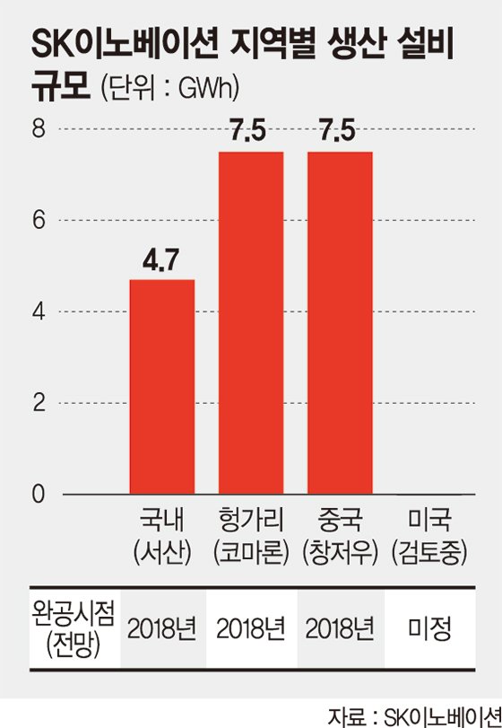 SK이노베이션의 목표는 2022년까지 전기차 배터리 20GWh, 2025년엔 50GWh 생산체제를 갖추는 것이다. 이를 위해 한국 서산공장을 4.7GWh 규모로 키우기 위해 증설에 들어갔고, 중국 창저우(7.5GWh)와 헝가리 코마롬(7.5GWh)에 배터리 셀공장을 건설 중이다.