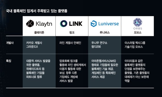 특히 이미 수백만 가입자를 확보하고 있는 거대 IT기업인 카카오와 라인이 각각 서비스에 집중한 블록체인 플랫폼 '클레이튼'과 '링크'를 개발중이고, 업비트로 유명한 두나무 역시 산업별 특화 블록체인인 '루니버스'를 준비하면서 국내 유력 기업들간의 블록체인 플랫폼 경쟁이 치열하다.