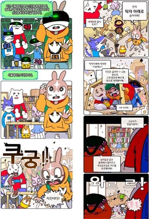 '지진 대피요령 웹툰 공모전' 대상에 이병희씨의 출품작 ‘토토와 친구들의 지진시뮬레이션‘이 최종 선정됐다.