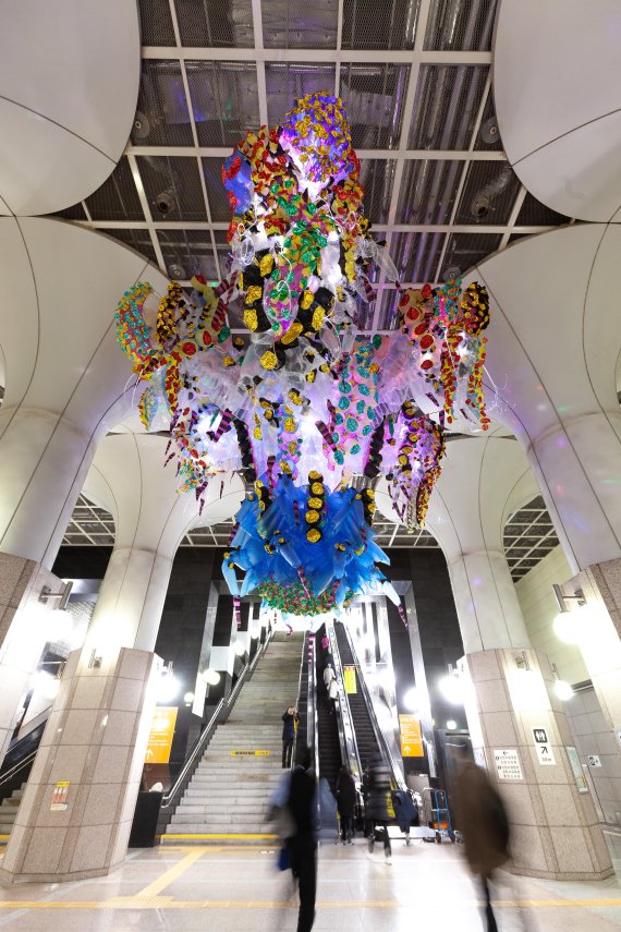 설치 작품 중 ‘한길뜨기’는 천장에 금속와이어로 설치되고 따뜻하고 포근한 컬러풀한 작물로 제작돼 이용객들이 작품을 직접 만지고 재료의 부드러움을 체험해 볼 수 있다.