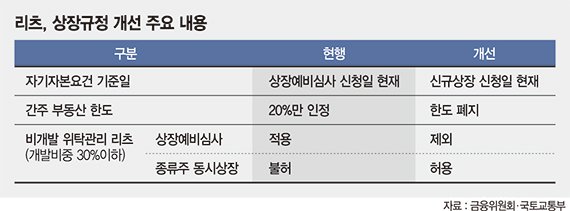 이에 따라 정부는 유가증권시장 상장규정을 개정하고 내년부터 자기자본요건인 100억원의 기준일을 상장예비심사 신청일에서 신규상장 신청일로 변경키로 했다. 공모를 통해 부동산투자회사법상 최저자본금 요건과 상장규정상 자기자본요건을 한 번에 충족하기 위해서다.