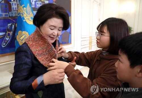 김 여사는 지난 9월에도 광주비엔날레 개막식 참석차 광주에 들러 센터 아이들에게 뜨개실을 선물했다. 아이들은 이 뜨개실로 문 대통령과 김 여사를 위한 목도리를 떠 이번 초청에서 김 여사에게 선물했다.