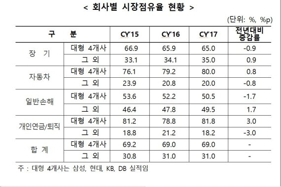 대형 4개 손보사의 자동차보험 시장 점유율은 지난 2015년 76.1%, 지난 2016년 79.2%, 지난해 80.0%로 지속 증가하고 있다.