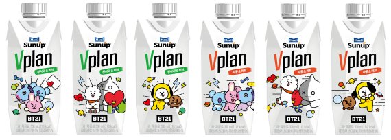 이번에 새로 선보인 BT21 캐릭터가 적용된 썬업 브이플랜 제품은 전국 편의점과 온라인 오픈마켓몰에서 구입할 수 있으며 소비자가격은 1500원이다.
