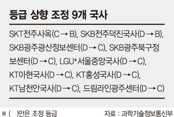 KT 아현국사를 비롯해 5개 통신사의 9개 국사가 등급을 상향 조정해야 하는 것으로 조사됐다. 반대로 서비스 권역 축소로 등급을 하향해야 하는 국사도 KT와 LG유플러스 등 총 3개 국사가 꼽혔다.
