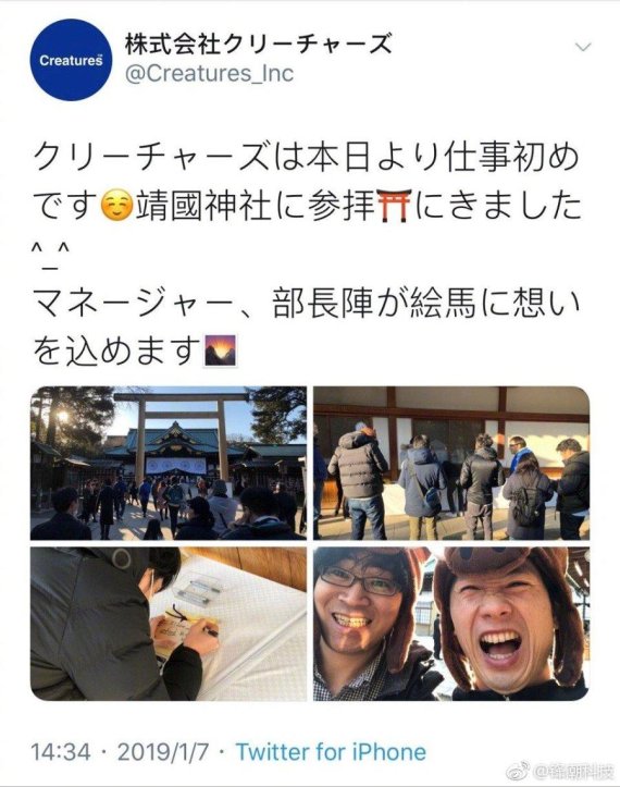 7일 일본의 유명 개발사인 '크리처스'는 회사 간부들이 야스쿠니 신사에서 참배하는 모습을 공식 트위터 계정을 통해 공개했다.
