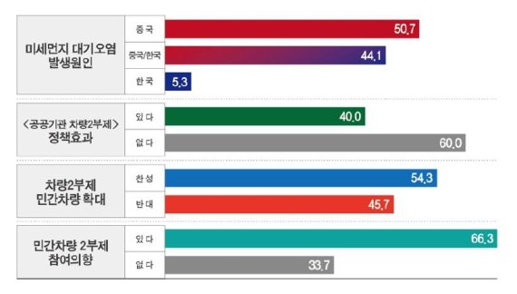 대표적인 것이 비상저감조치에 따른 차량2부제 실시다. 환경보건시민센터가 지난 15일 발표한 여론 조사 결과에 따르면 국민 10명 중 6명은 공공기관 차량2부제에 대해 '정책 효과가 없다'고 생각했다.