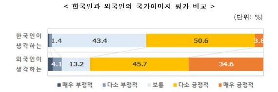 우리나라의 전반적 이미지에 대해서는 우리 국민들이 평가하는 것보다(긍정 54.4%) 외국인들이 평가하는 이미지(긍정 80.3%)가 더욱 긍정적이었다. 긍정적인 이미지에 영향을 미치는 요인은 우리의 한류, 기초예술 등 현대문화(35.3%)가 가장 높았고, 이어서 경제수준(17.5%), 문화유산(12.3%), 한국제품 및 브랜드(12%), 북핵문제(5.7%) 순으로 조사됐다.