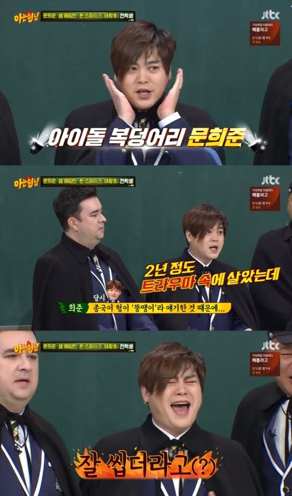 이에 김희철은 "형은 띠 때문이다. 형 돼지 띠지?"라고 물었지만, 문희준은 "말띠다"라고 대답해 웃음을 줬다.