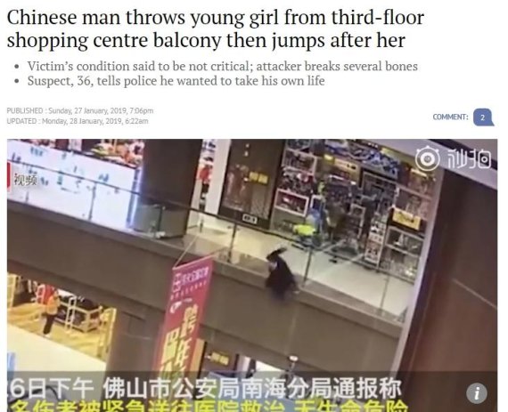 28일(현지시간) 사우스차이나모닝포스트 등에 따르면 지난 26일 오후 12시께 광둥성 포샨시 한 백화점 3층에서 리(36)씨가 주위의 여아를 던진데 이어 자신도 투신자살을 시도했다.