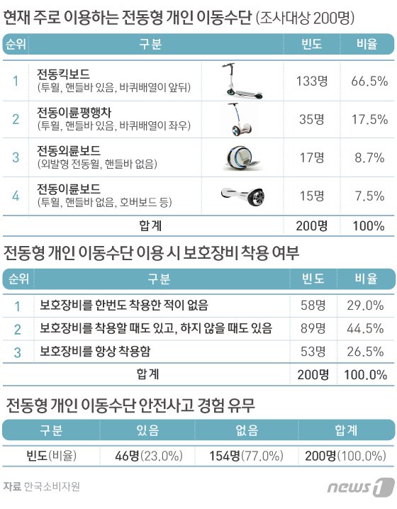 한국소비자원은 전동형 개인 이동수단 이용자 200명을 대상으로 한 설문조사한 결과 4명 중 1명꼴인 46명(23.0%)이 실제 안전사고를 경험해 발생 빈도가 높았다고 14일 밝혔다.