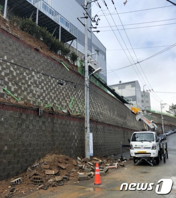 (부산ㆍ경남=뉴스1) 조아현 기자 = 19일 낮 12시45분쯤 부산 사하구 구평동 유통회사의 축대가 무너져 내렸다.