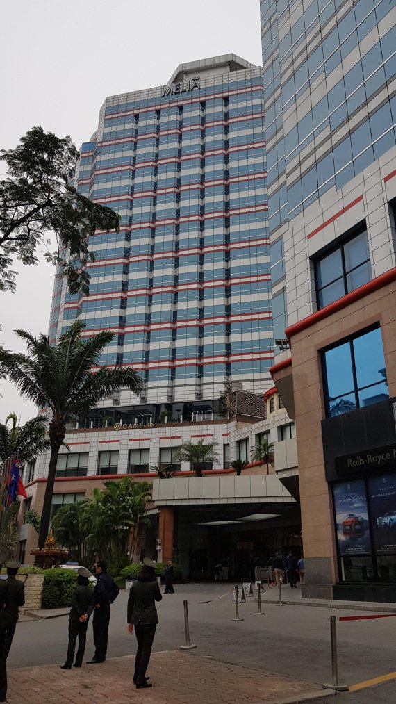 김정은 북한 국무위원장이 2차 북미정상회담이 열리는 베트남 하노이 현지에서 머물 가능성이 큰 멜리아호텔. 바로 앞에는 베트남 공안이 주변을 경계하고 있다. /사진=이설영 기자