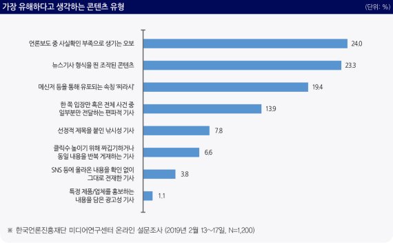 이어 뉴스기사 형식을 띈 조작된 콘텐츠(23.3%) 찌라시(19.4%) 편파적 기사(13.9%) 낚시성 기사(7.8%) 어뷰징 기사(6.6%) SNS 전재한 기사(3.8%) 광고성 기사(1.1%) 순으로 유해하다고 꼽았다.