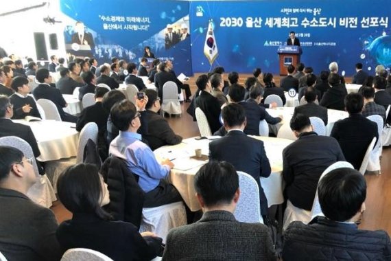 송철호 울산시장은 26일 울산과학기술원 경동홀에서 '2030 울산 세계 최고 수소도시' 비전을 선포하고 전국 수소 전문기업.기관이 동참한 '수소산업 육성 공동 선언문'을 발표했다. 또 이날을 '울산 수소산업의 날'로 지정했다.