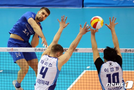 (서울=뉴스1) 조인식 기자 = V-리그에서 최초로 한 경기에 한 팀에서 2명이 트리플크라운을 달성하는 진기록이 나왔다.