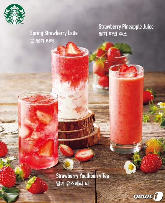 딸기의 새콤함과 아가베 시럽의 달콤함이 우유와 어우러진 '봄 딸기 라떼', 스타벅스만의 시그니처 티인 유스베리가 딸기와 만나 고급스러운 맛을 자아내는 '딸기 유스베리 티', 새콤한 딸기와 달콤한 파인애플이 조화로운 '딸기 파인 주스' 등이다.