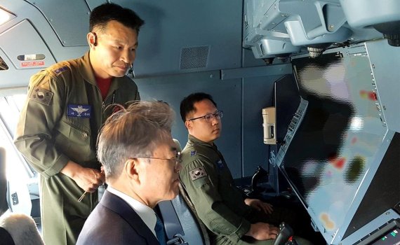 문재인 대통령은 5일 우리나라 최초의 공중급유기인 KC-330 '시그너스'(Cygnus)를 참관했다.