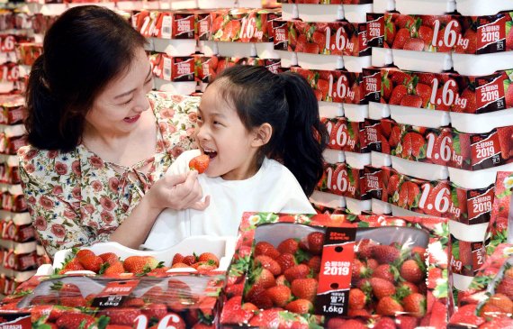 모델이 6일 서울 등촌동 홈플러스 강서점에서 어린이와 함께 딸기를 선보이고 있다.