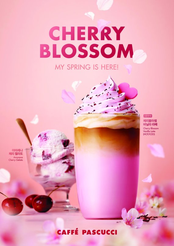 '체리블라썸 바닐라 라떼'는 히비스커스 향 크림과 바닐라, 에스프레소가 조화를 이루는 라떼음료다. 음료 위에 분홍색 휘핑크림과 하트 초콜릿을 올려 벚꽃을 연상케한다. '아마레나 체리 젤라또'는 부드러운 라떼 젤라또와 상큼한 체리가 어우러진 아이스크림 메뉴다.
