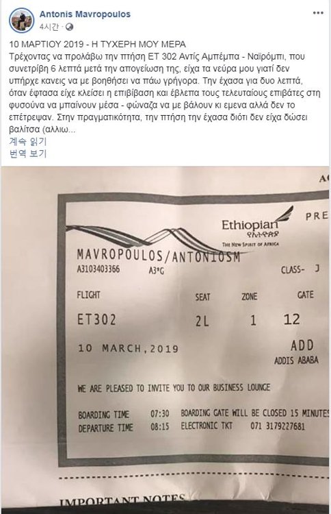2분 차로 비행기 탑승을 놓쳐 에티오피아 여객기 추락 사고에서 가까스로 목숨을 구한 그리스 남성이 화제가 됐다.