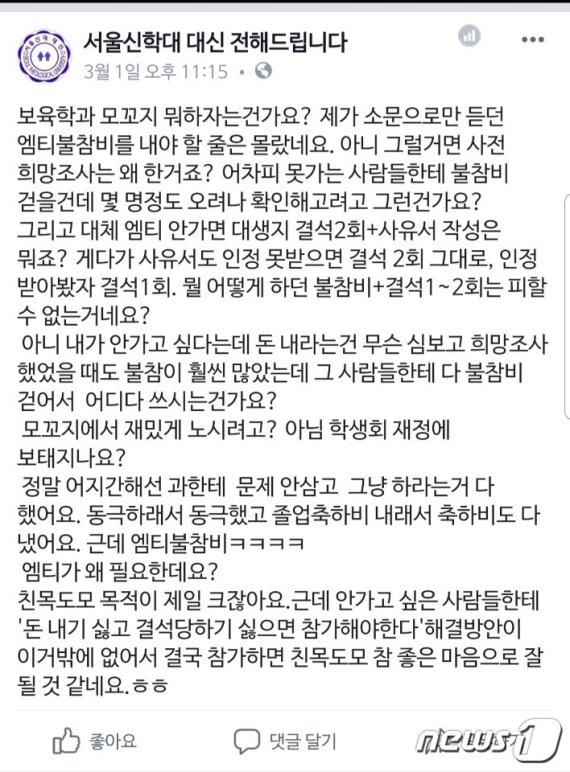 한 학생은 SNS에서 "모꼬지 모하자는 건가요? 제가 소문만으로 듣던 엠티 불참비를 내야 할 줄은 몰랐네요. 내가 안가고 싶다는데 돈 내라는건 무슨 심보고 희망조사했었을 때도 불참이 훨씬 많았는데 그 사람들한테 다 불참비 걷어서 어디다 쓰시는 건가요?"라며 비난했다.