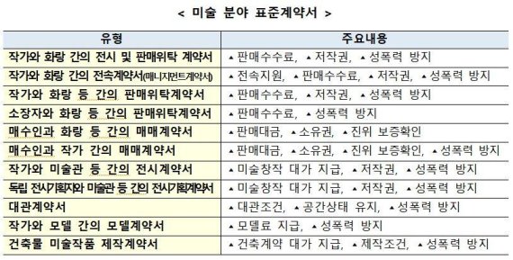 문화체육관광부는 미술계에서의 공정한 계약문화를 만들고 창작자의 권익을 향상하기 위해 ‘미술 분야 표준계약서’를 도입한다.