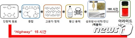 기존에 아라미드 나노섬유를 만들기 위해서는 아라미드 방탄 섬유를 먼저 만든 후 이것을 나노화하는 두 가지 단계를 거쳤다.
