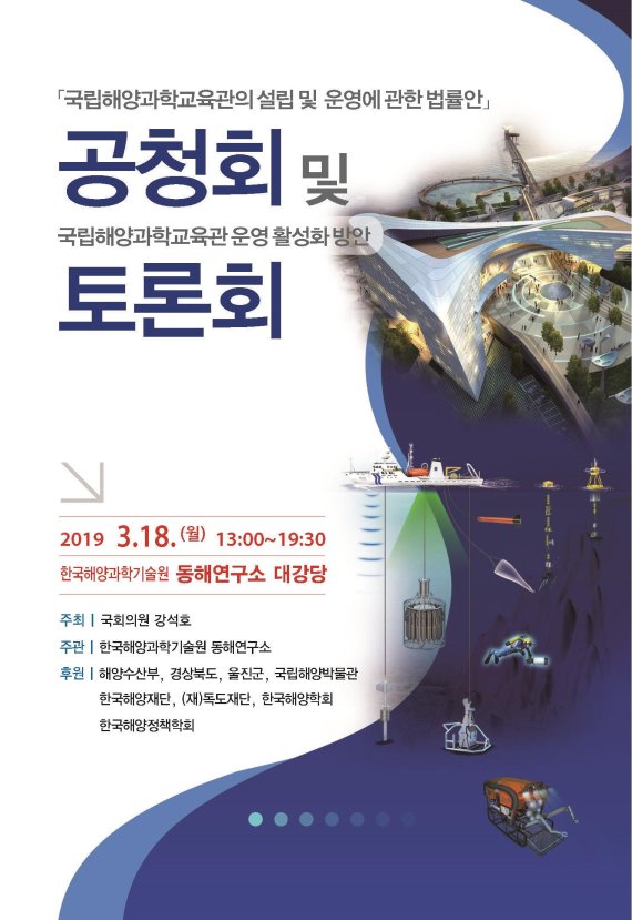 국회 강석호 의원실에서 주최하고 KIOST 동해연구소가 주관하는 이번 행사는 각계의 의견을 수렴해 ‘국립해양과학교육관’의 설립과 운영에 대한 법률의 제정과 운영 활성화 방안을 논의하기 위해 마련됐으며, 국회와 해양수산부, 경북도와 울진군의 관계자 및 지역주민 등 약 300여명이 참석할 예정이다.