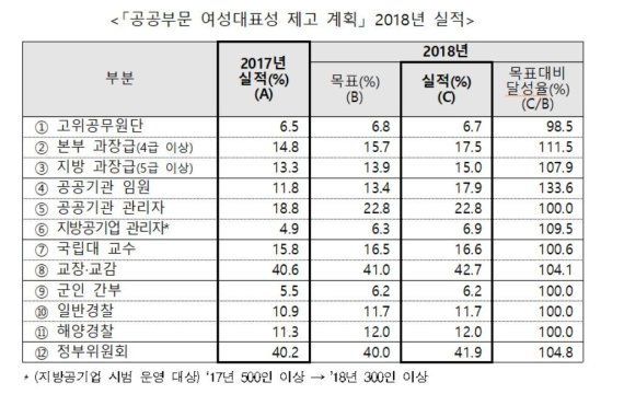 여성가족부는 공공부문 12개 분야의 2018년 '공공부문 여성 대표성 제고' 추진 상황을 확인하고, 올해 계획을 수립해 19일 국무회의에 보고했다.