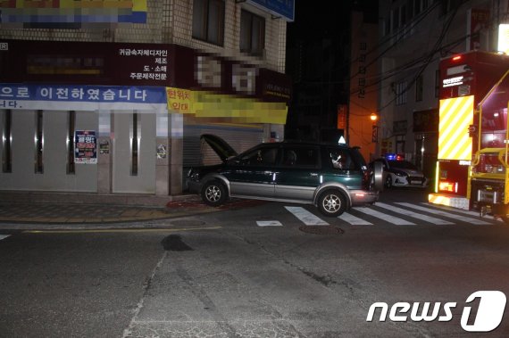 (부산=뉴스1) 조아현 기자 = 24일 오전 1시50분쯤 부산 금정구 장전동에 있는 한 가구매장 앞 도로에서 싼타모가 택시와 충돌했다.