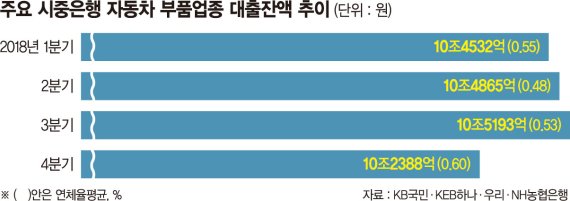 25일 금융권에 따르면 5대 시중은행 중 자료 집계가 불가능한 신한은행을 제외한 국민·하나·우리·농협 등 4개 은행의 지난해 4·4분기 자동차 부품업체 대출잔액은 10조2388억원으로 집계됐다. 이는 같은 해 1·4분기 10조4532억원에 비해 2.05%(2144억원) 줄어든 것이다.
