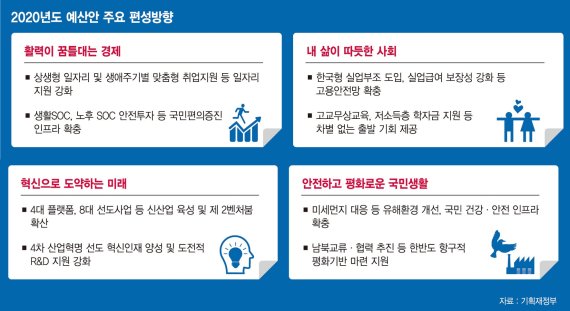 정부가 이날 국무회의를 통해 확정한 '내년도 예산안 편성 및 기금운용계획안 작성지침'은 경기대응과 소득재분배, 혁신성장에 중점을 둔 재정의 적극적 운용에 방점이 찍힌다. 지침은 중앙정부, 지자체 및 공공부문이 내년 예산안 편성 시 준수 또는 준용해야 하는 가이드라인 역할을 한다.