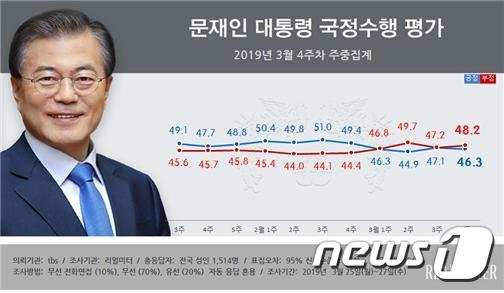 여론조사기관 리얼미터가 tbs의 의뢰로 지난 25일부터 27일까지 조사해 이날 발표한 2019년 3월 4주차 주중집계 결과에 따르면, 문 대통령의 국정수행 지지율은 지난주보다 0.8%p 하락한 46.3%였다.